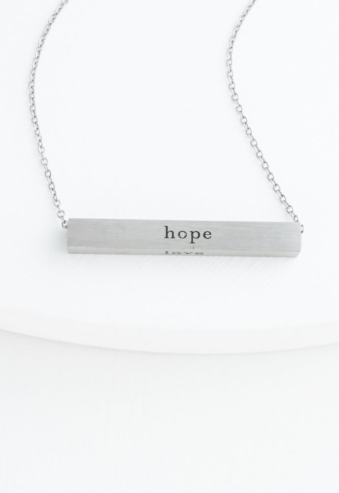 Each horizontal stainless steel Faith bar is engraved with the powerful words, faith, hope, and love hanging from a simple adjustable chain. Made for everyday wear you can carry this powerful message with you wherever you go as a gentle reminder that as you walk in faith, hope, and love you can restore hope to a broken world. Because of your purchase, exploited women and girls will experience freedom, establish independence, and develop careers.
