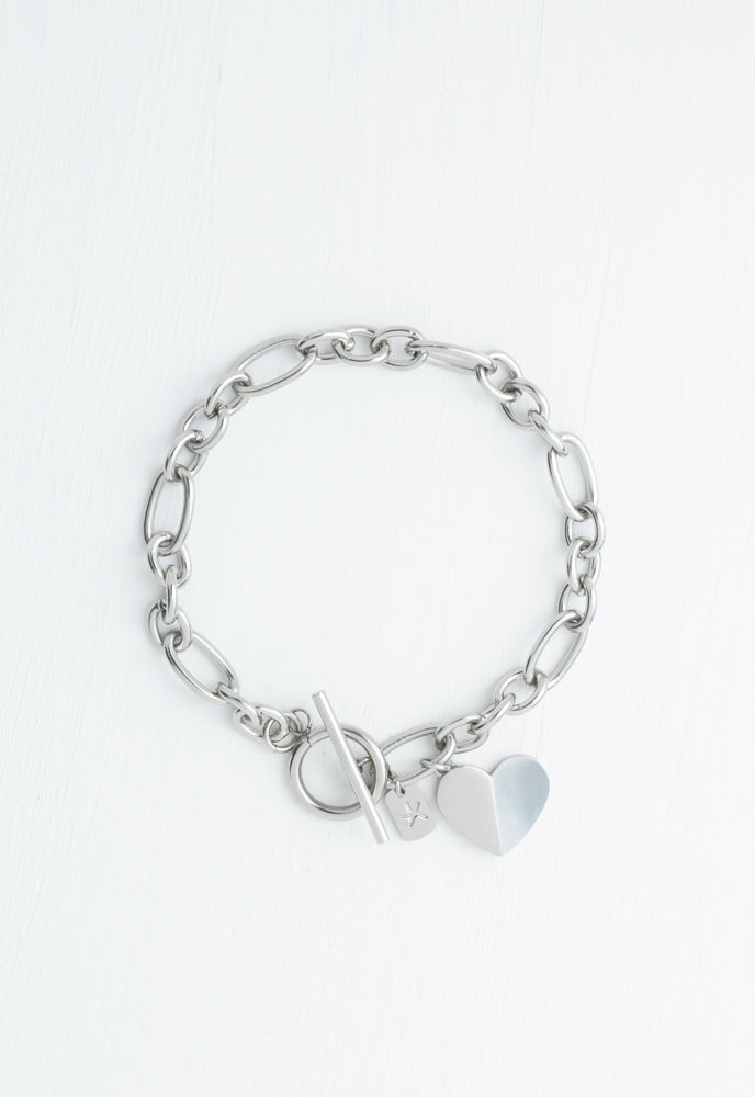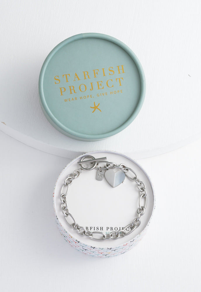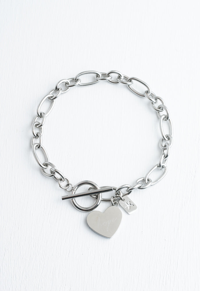 We lovingly package our Give Hope Bracelet in our gold and white gift box. The stainless steel chain with toggle closure sets the perfect stage for the beautiful mother of pearl and silver coming together in the heart charm. Each speaks of the restoration you catalyze and our shared heart to see women still in exploitation experience freedom, establish independence and develop dignified careers. On the reverse side, we have engraved the word ‘hope.’ We hope that as the women we meet receive this beautiful gift, they will have new hope for a life outside exploitation—May what starts with a gift of hope grow into an opportunity for more women to experience freedom.
